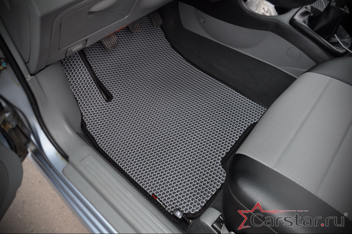 Толщина ковриков EVA составляет 10-12 мм. Глубина ячеек 7-8 мм. Такая толщина ковриков позволяет им служить довольно долго, не протираясь до 3 лет. А благодаря такой глубине ячеек коврик EVA площадью 1 кв.м. способен захватить около 3,5 л жидкости, сохраняя в чистоте вашу обувь и обивку салона.