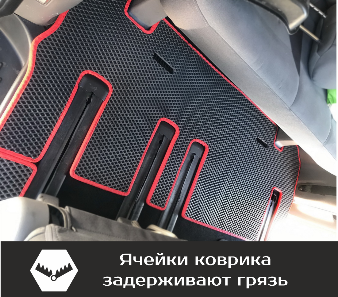 Изделия EVA имеют специальную ячеистую структуру (ячейки глубиной 8 мм), которая эффективно задерживает грязь и воду, оставляя вашу обувь и поверхность обивки салона или багажника абсолютно чистыми. Также эти ячейки очень легко и быстро очищаются без применения специальных инструментов, в том числе, при помощи бесконтактной мойки.