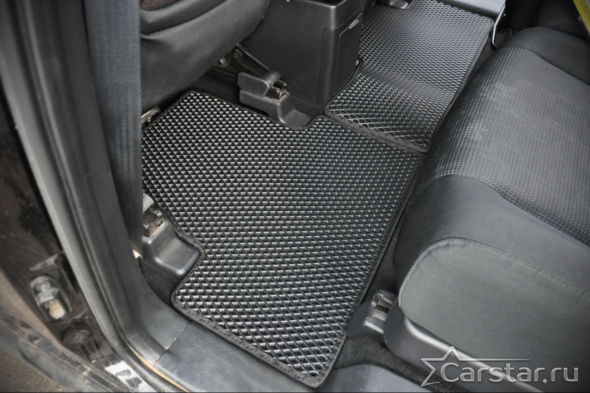Толщина ковриков EVA составляет 10-12 мм. Глубина ячеек 7-8 мм. Такая толщина ковриков позволяет им служить довольно долго, не протираясь до 3 лет. А благодаря такой глубине ячеек коврик EVA площадью 1 кв.м. способен захватить около 3,5 л жидкости, сохраняя в чистоте вашу обувь и обивку салона.