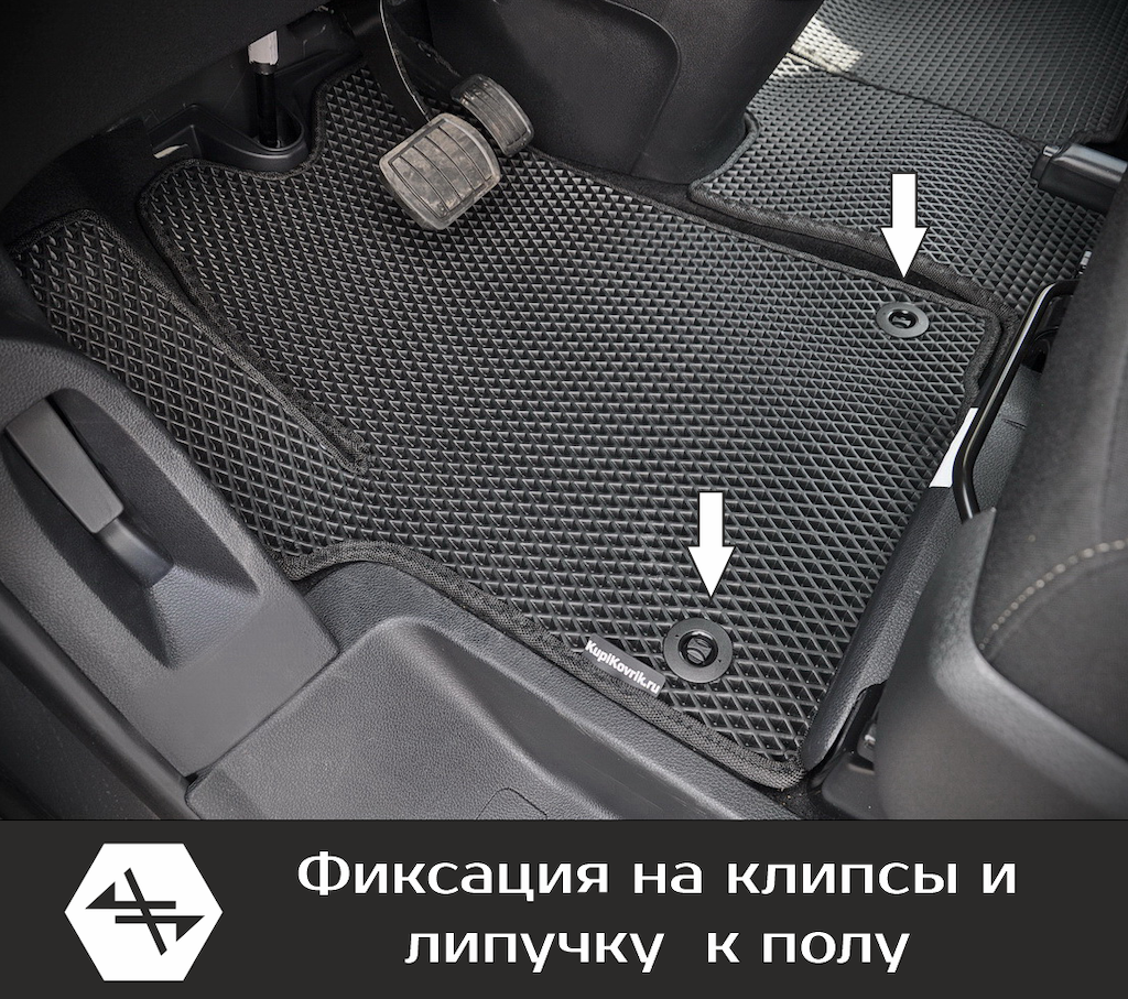 Коврики EVA надёжно крепятся с помощью оригинальных систем фиксации. Благодаря клипсам, а также липучке, коврики защищены от смещений, что обеспечивает комфорт и безопасность вождения. Максимальное удобство также достигается точными, улучшенными лекалами для каждого автомобиля.