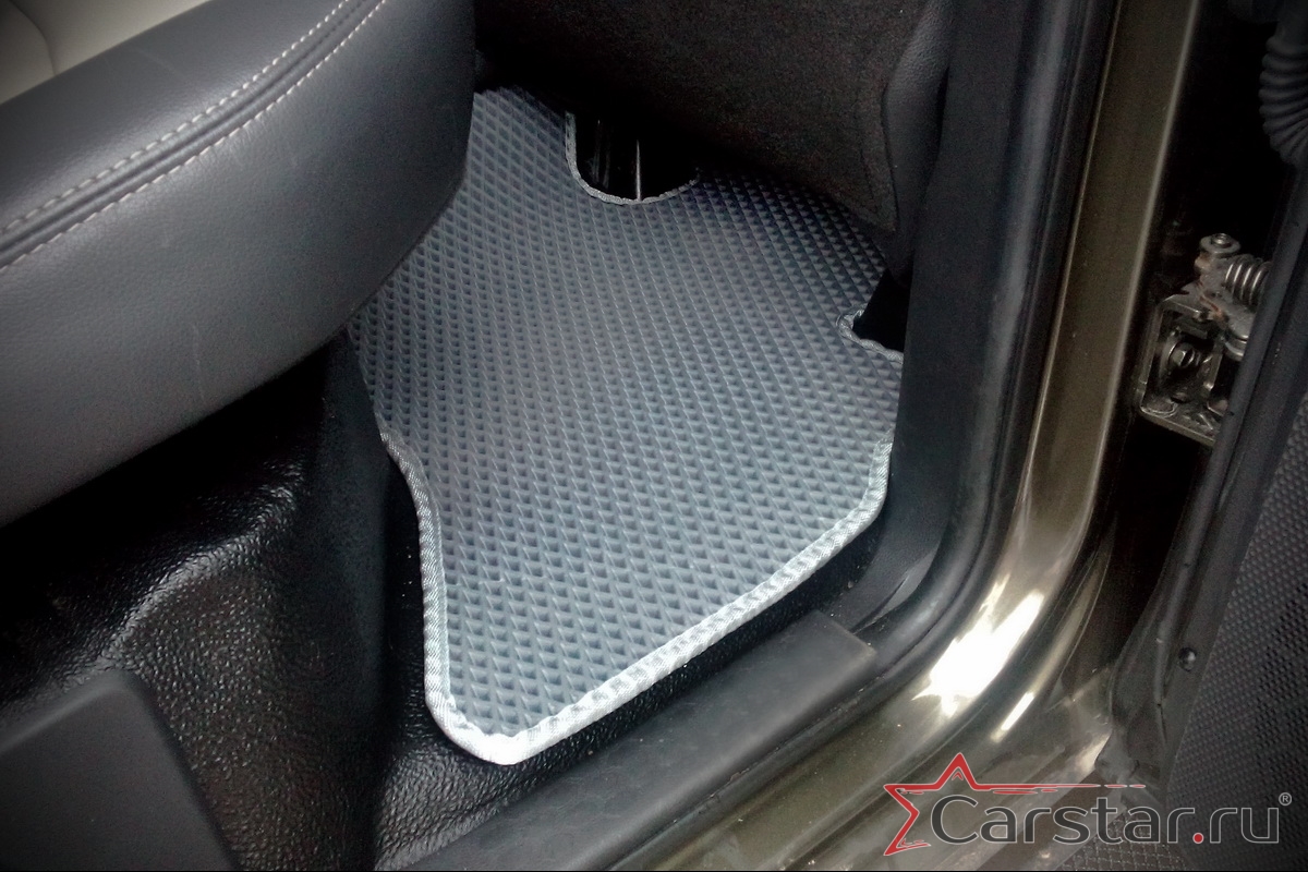 Текстильные коврики надёжно крепятся с помощью оригинальных систем фиксации. Обратная сторона имеет противоскользящее покрытие, что обеспечивает защиту от смещений и безопасность. Максимальное удобство достигается точными лекалами.
